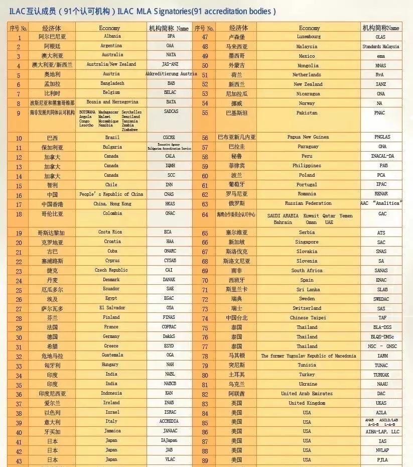 中国合格评定国家认可委员会(CNAS)是国际认可论坛(IAF)、国际实验室认可合作组织(ILAC)、亚太实验室认可合作组织(APLAC)和太平洋认可合作组织(PAC)的正式成员。