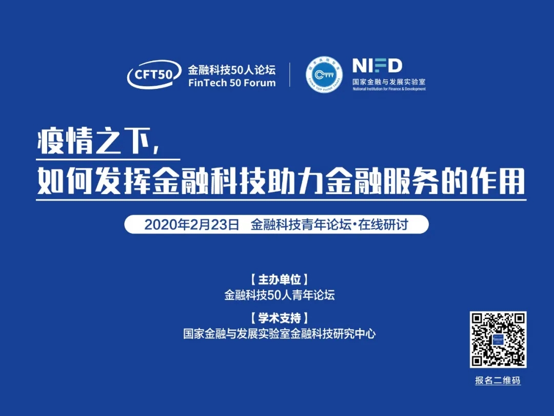 近日,由金融科技50人青年论坛主办,国家金融与发展实验室金融科技研究中心学术支持的“2020金融科技青年论坛首场研讨会”在线举办。本期会议聚焦:疫情之下,金融科技如何助力金融服务升级。