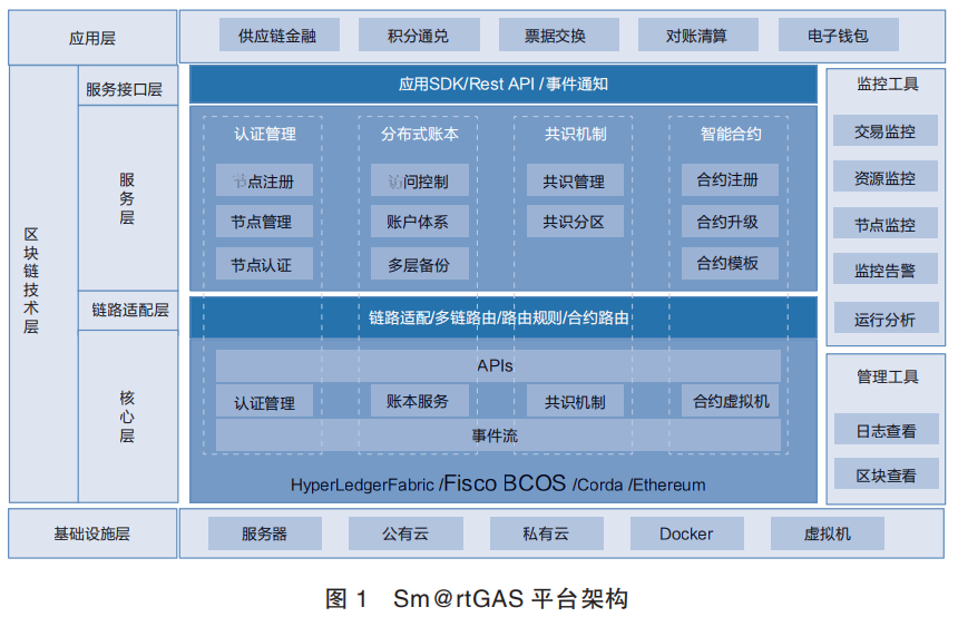 Sm@rtGAS为业务的发展提供了区块链技术应用的基础,并构建了在供应链金融、农产品溯源、农业金融服务、电子签购单等众多领域的业务应用。作为区块链底层平台,屏蔽了区块链底层的复杂度,降低开发者的门槛,大幅提高区块链应用的开发效率。提供对应用的功能支持,主要包括: