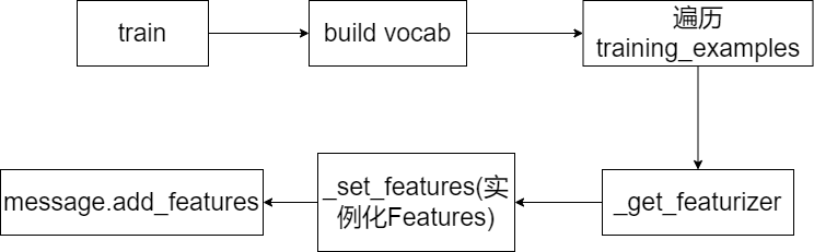 components的train函数 -> 构建字典:基于最小词频和词典最大容量 -> 遍历所有的训练数据 -> 得到句子的id列表 -> 实例化特征类Features - > message设置