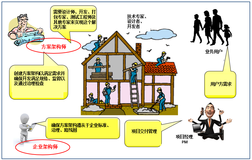 一个复杂的IT系统建设,需要多种不同技能团队的共同配合,就像下图中一所房屋的搭建的卡通画所示意,涉及到用户、项目经理PM、架构师、工程师等,用户提出需求,PM 控制工期、进度,工程师完成具体的开发和施工,那么架构师应该做什么?他/她应该与客户进行有效沟通,梳理清楚客户需求,与项目经理、技术专家和工程师进行讨论,设计出可行的、满足客户需求的、同时又在预算范围内的架构方案,并跟进方案实施和解决服务交付中出现的任何架构相关问题。