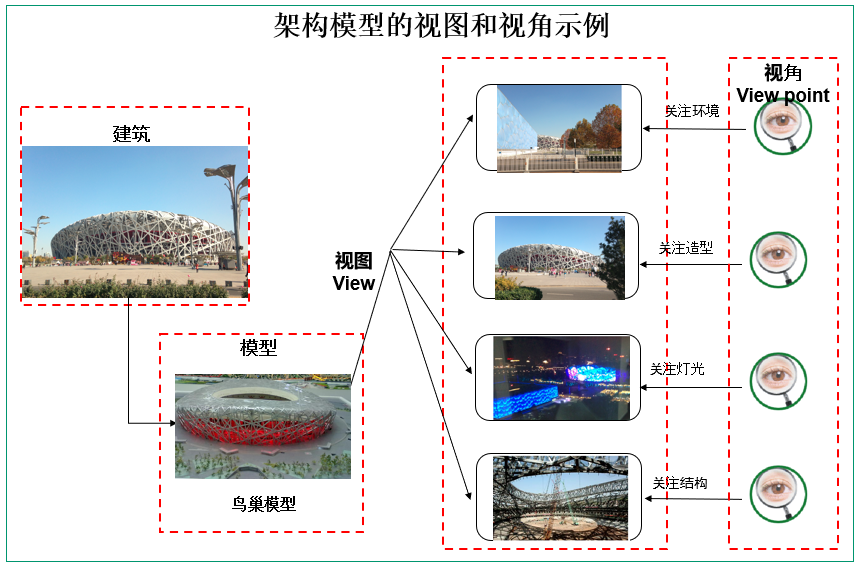 架构视图与视角的模型途径可能听上去有些抽象,为便于理解,我们举例来看复杂的建筑设计是如何实现的,例如,北京奥运会场馆鸟巢建筑,其中规划、运行、环保、建设等许多部门都对场馆建筑提出了不同要求,对于这些观点要求,我们通过视角的规格描述来要求整个系统的设计、建设等部门做到一一满足,也就是设计系统模型的不同视图要遵从上述环境、造型、灯光、结构视角的要求,并且还要综合考虑这些不同视角要求之间的兼容和协调,这其实就是模型-视图-视角架构途径在现实生活中的一个实际应用,如下图所示: