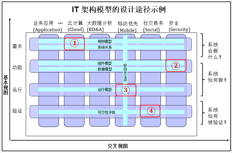 同样IT架构模型也可以从不同方式和角度来观察,所得到的结果依赖于要表达的视角和上下文,并因干系人而变。观察架构时,将架构视角分为基本视角(每行)和交叉视角(每列), 基本视角描述可以观察的事物类型和记录方式,交叉视角控制实际看到的内容,它是描述投射到基本视角的过滤器,记录基本视图的工件描述,其中干系人的顾虑决定交叉视角, 横向的基本视角(行)和纵向的交叉视角(列)相交有很多交叉处, 他们表达了架构设计的特别关注并提供对解决方案的洞察,同时也是架构设计不同视图要达到的目标,包括系统会做什么?系统如何去做?以及系统如何被验证? 如下图所示意。具体实现时是通过架构方法论的过程步骤去完成用例模型、系统关系、组件模型、运行模型等架构工件设计。