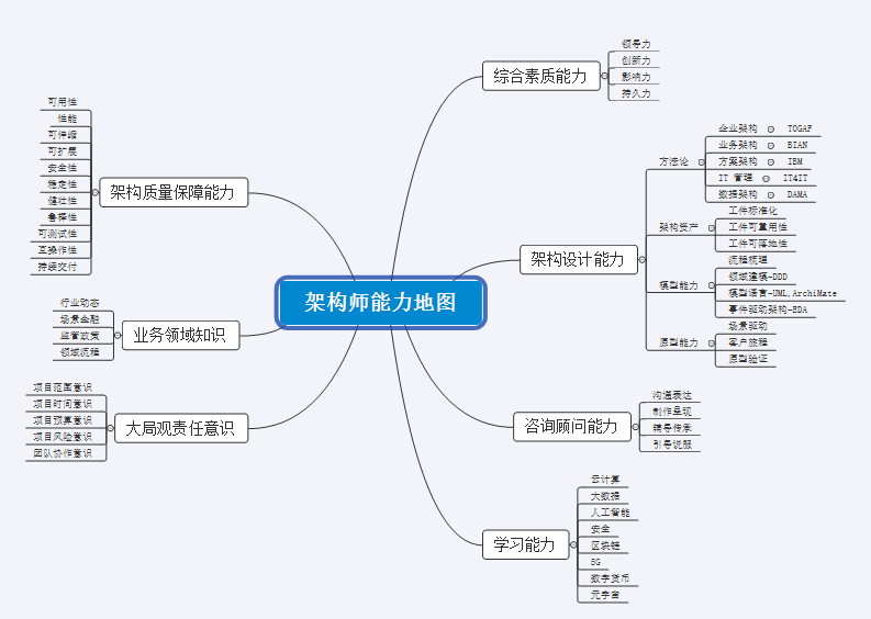 一个优秀的架构师要持续坚持自我修炼及顿悟,不断克服自身的一些缺点,例如:专注自己擅长领域而忽略其他方面; 相信技术万能, 容易被技术所迷惑; 追求完美,不停的设计变动,不能在范围、时间、资源之间取得平衡; 不习惯重用,认为自己能做一切等等,这样架构师才能适应数字化时代的发展和不断进步,真正做到知行合一、宏观和微观相结合及系统化思考,架构师能力地图参考如下图所示意: