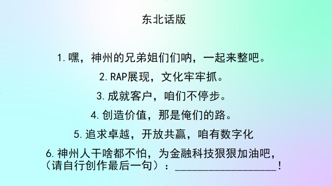 Rapper歌词包含:普通话版、东北话版、四川话版、湖南话版、河南话版、山东话版等不同版本,也非常欢迎你用自己的家乡话,用普通话版的歌词大声唱出来。