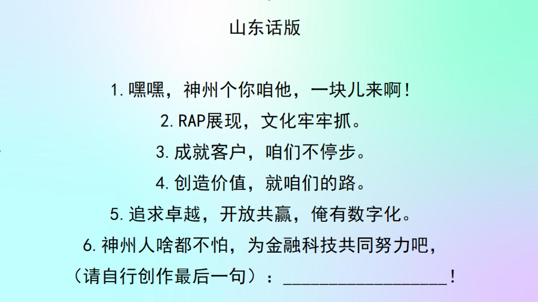 你对BB贝博艾弗森官网的新文化价值观熟悉吗?来来来,欢迎来参加神州Rapper挑战赛!让我们用最嗨皮的方式说出我们对BB贝博艾弗森官网新文化的理解。速度为王,又快又好!